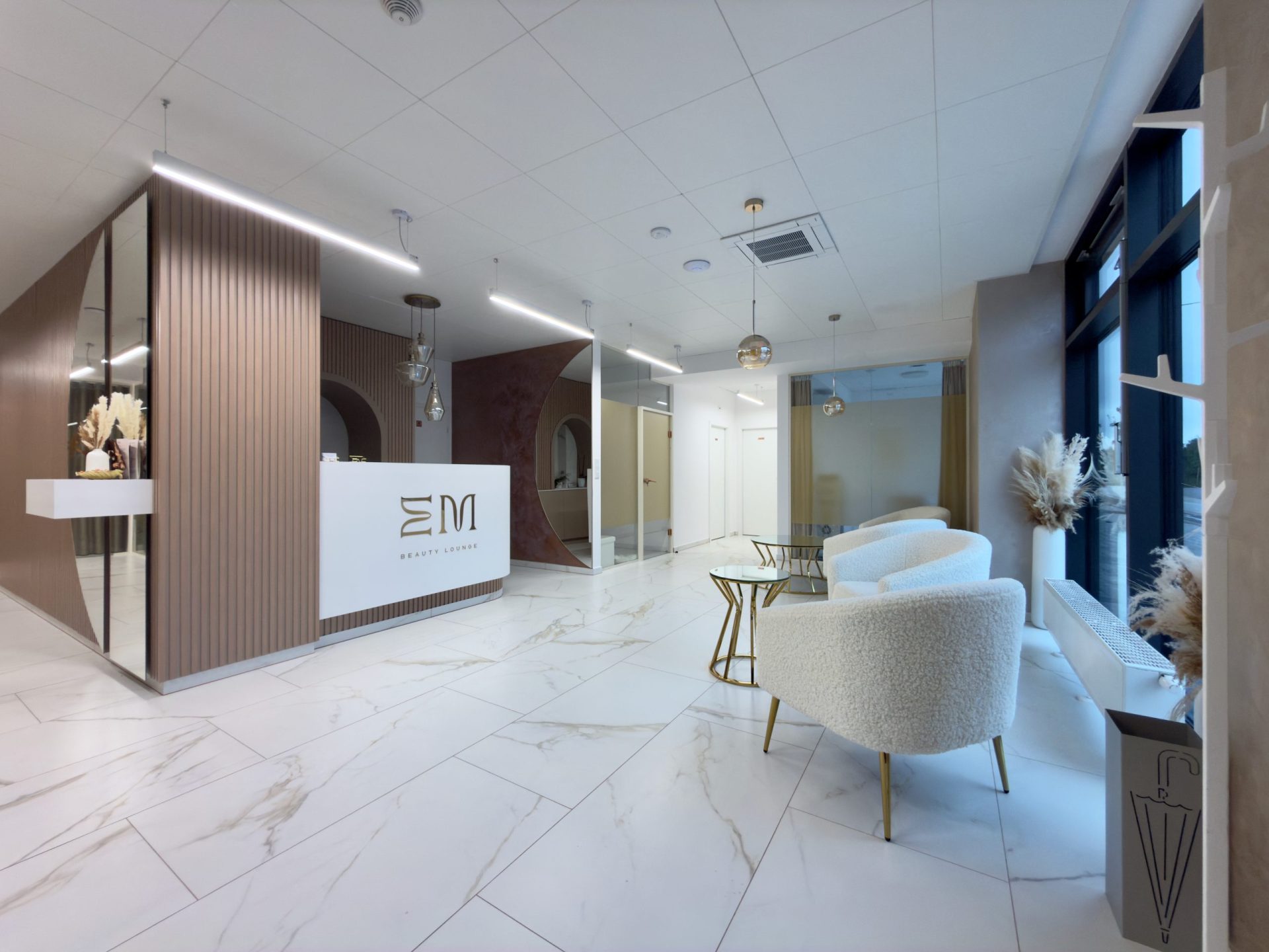 Recepce, čekárna a školící místnost salonu EM Beauty Lounge, kde působím.